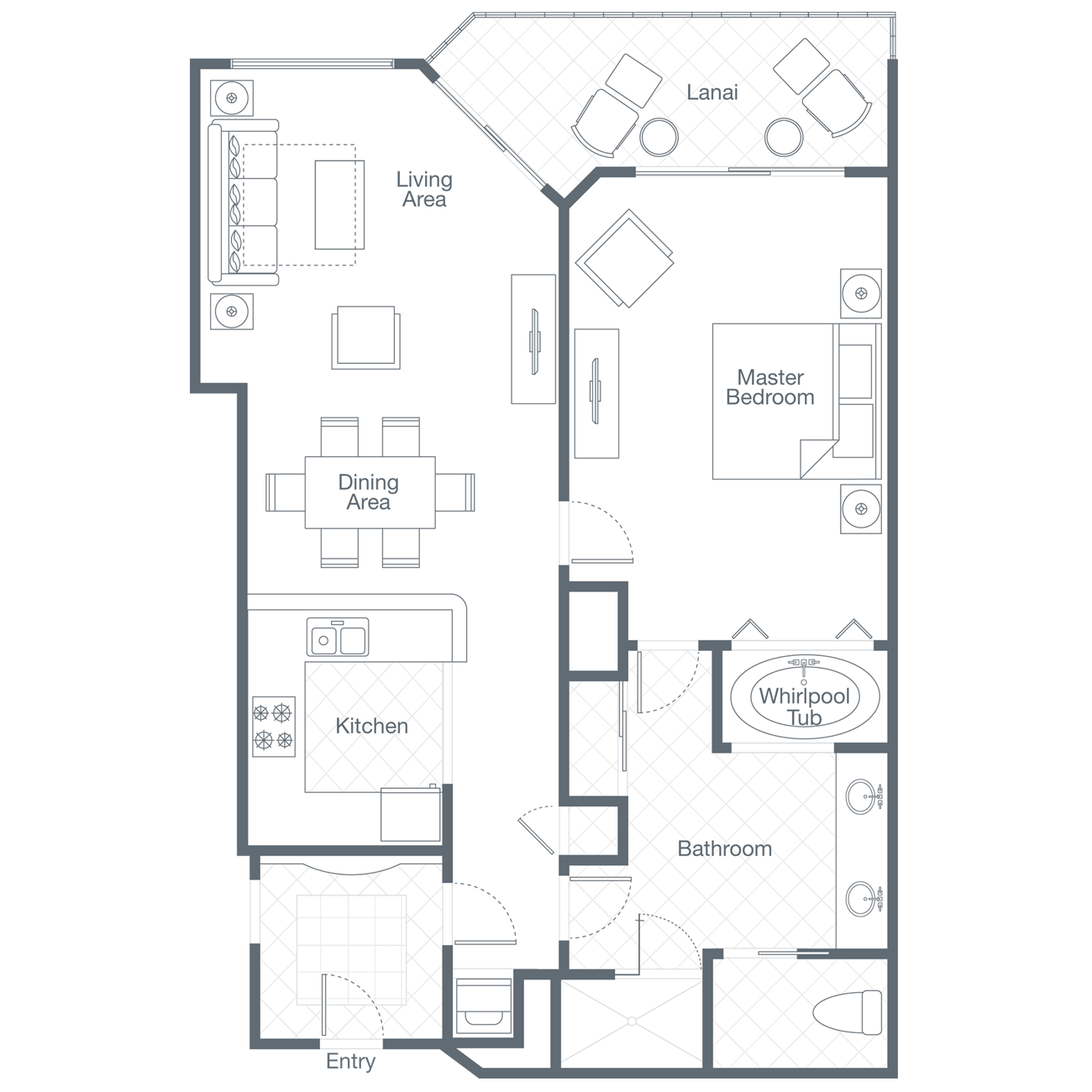 Please Note: This is an artist's rendering of one type of one-bedroom villa. It is provided to give a general idea of villa rooms/area. The dimensions, interior layout and fixtures of the villa as built may vary from those shown.